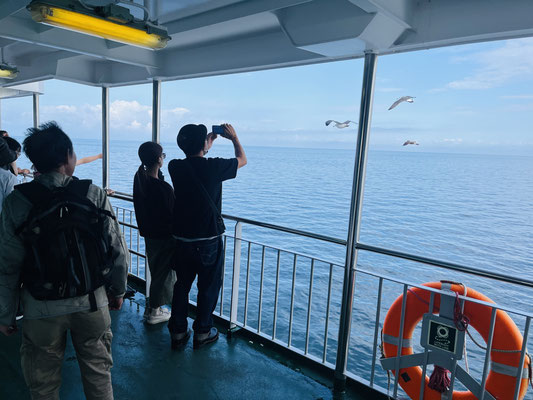 乗船客からのエサを目当てにフェリーと並行するカモメ達。エサに食いつく度に盛り上がってましたよ笑