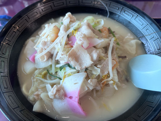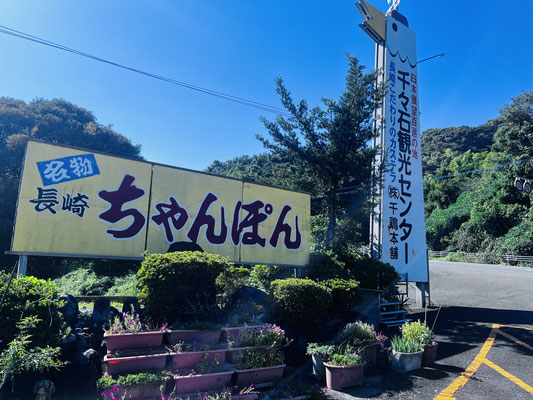 峠道にあるちゃんぽんの看板。吸い込まれるようにお店に向かってしまいました。豚骨ちゃんぽん、美味です!